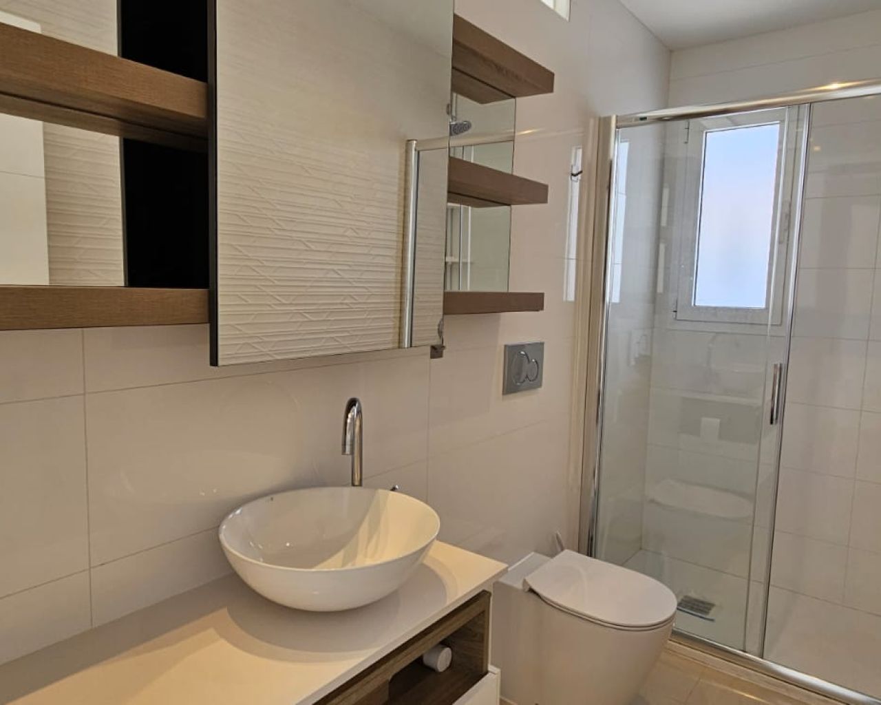 Ground floor: Spacious living-dining room with open-plan kitchen, large windows flooding the space with natural light, electric shutters, and a full bathroom with shower.