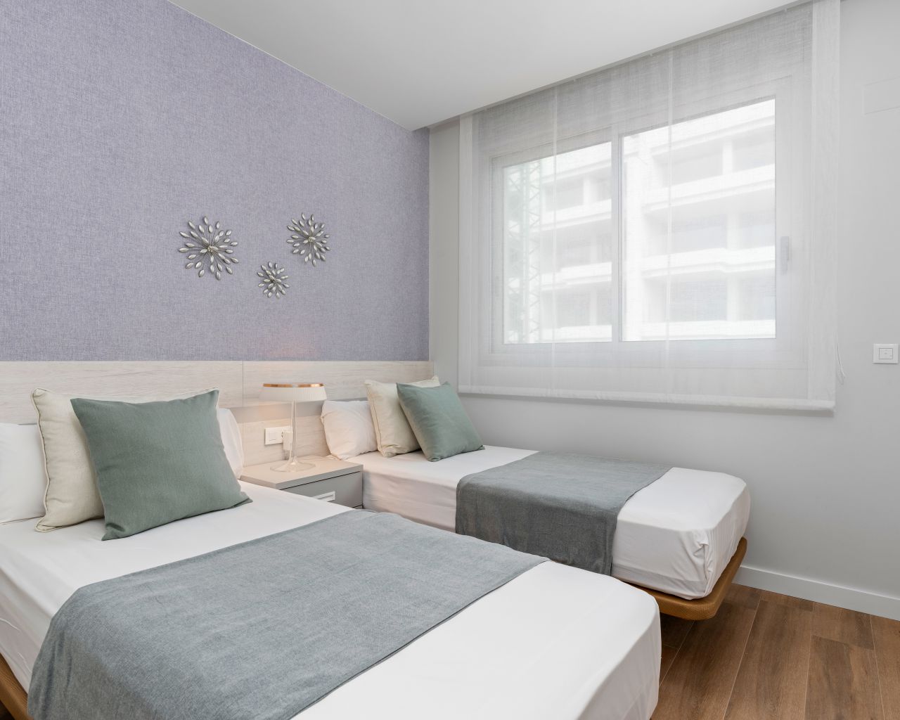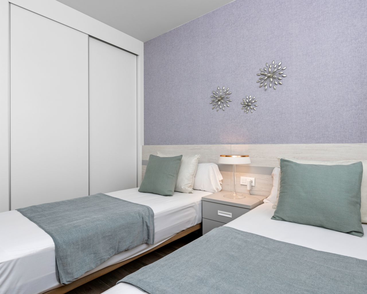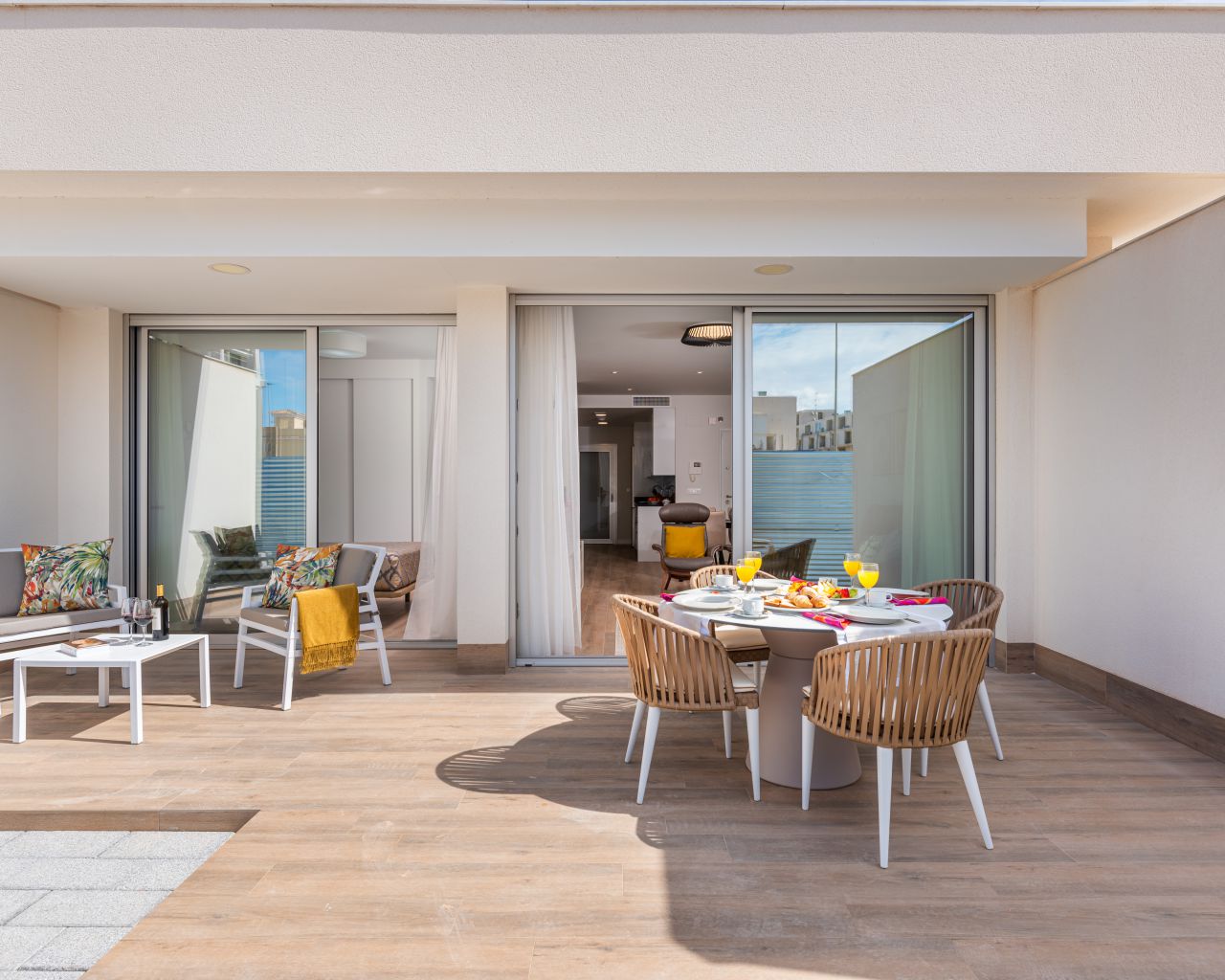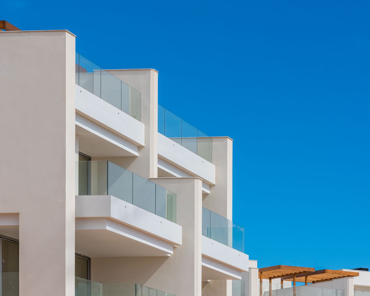 Los apartamentos de la primera y segunda planta ofrecen un acogedor y soleado balcón de entre 22-23 m2 hacia la piscina comunitaria y el jardín.